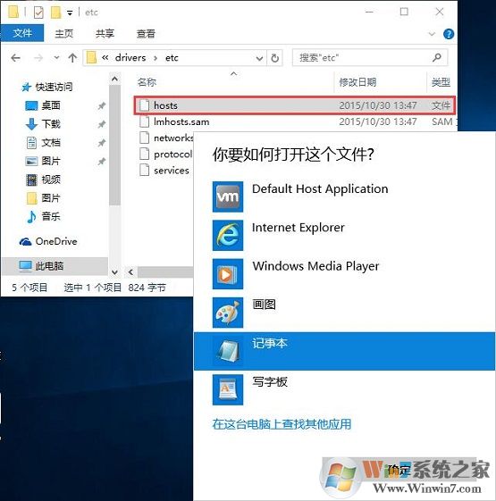 3、在hosts文件上單擊右鍵,選擇打開方式,選擇記事本 ,點確定;