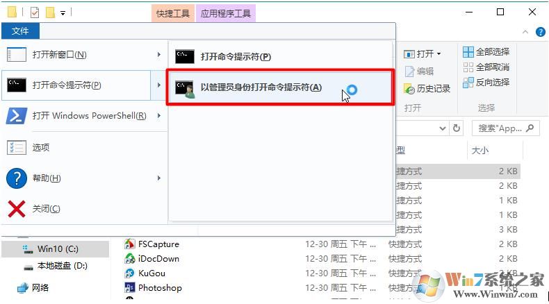 3、在開始菜單右鍵磁貼,打開文件所在位置,定位到磁貼的快捷方式所在文件夾,打開命令提示符:點(diǎn)擊文件—打開命令提示符—以管理員身份打開命令提示符。輸入下面的命令回車運(yùn)行即可: