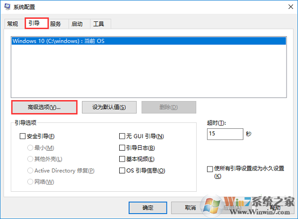 3、在系統(tǒng)配置界面,來到引導(dǎo)選項(xiàng)卡,點(diǎn)擊下方的“高級(jí)選項(xiàng)”。