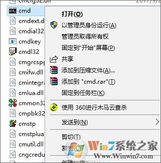 2、在cmd上單擊右鍵,選擇“以管理員身份運行”;
