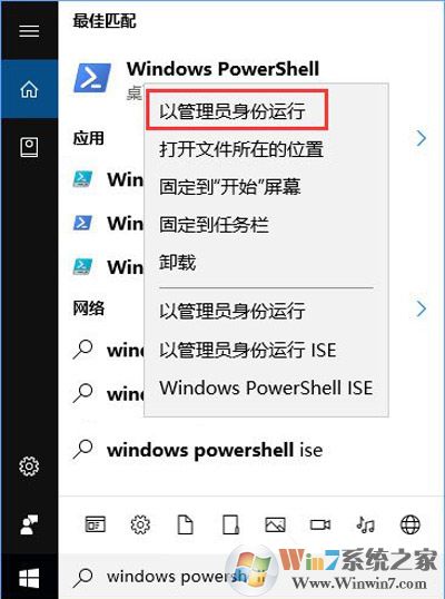 2、在Cortana搜索框輸入windows powershell,鼠標右擊windows powershell以管理員運行,復制粘貼以下命令運行。