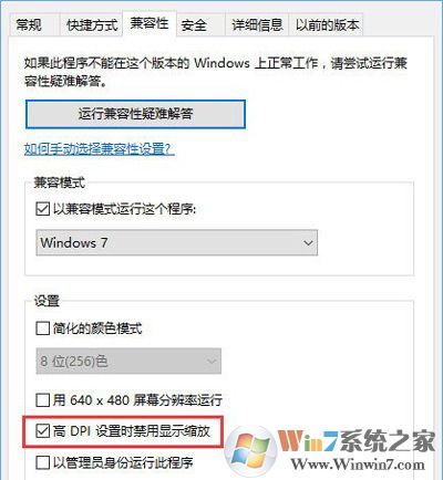 5、選擇“兼容性”選項卡,勾選“高DPI設(shè)置是禁用顯示縮放”選項,然后點擊“確定”按鈕保存設(shè)置即可,如圖: