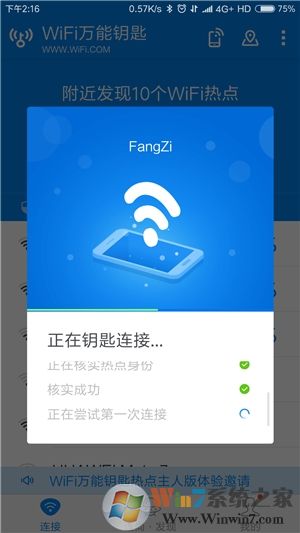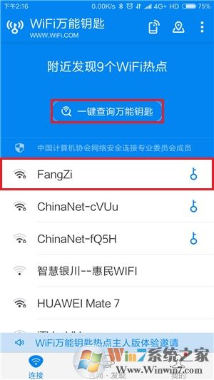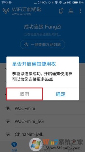 2.若此時手機沒有通過熱點連接到外網(wǎng),則需要事先打開移動數(shù)據(jù)和WiFi功能。然后點擊該軟件“連接”界面中,最上方藍色區(qū)域的“一鍵查詢?nèi)f能鑰匙”按鈕,此時軟件會結(jié)合云端數(shù)據(jù),搜索附近被其他用戶分享過的熱點,若找到對應(yīng)的熱點SSID名稱后面會有一個藍色的“鑰匙”圖標,然后需要點擊信號最強的一個WiFi熱點,接著點擊“鑰匙連接”按鈕嘗試快速連入,通常只需1-5秒鐘的時間就能成功連上,如果是安裝后第一次連接成功,還會彈出開啟通知使用權(quán)的提示,為了避免自帶的廣告消息造成騷擾,此時建議點擊“取消”按鈕。
