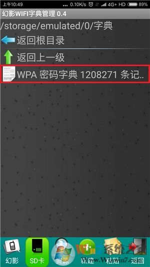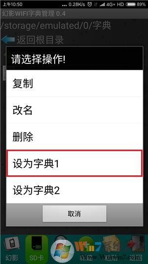 軟件在此處已經(jīng)提供了8個弱密碼字典,如果要使用內(nèi)存中已下載的字典文件,可以點擊下方的“SD卡”選項卡,然后打開字典文件的存儲位置,選擇并長按一個要使用的字典文件,接著在彈出的操作菜單中點擊“設(shè)為字典1”項即可,同理還可繼續(xù)指定字典2文件。