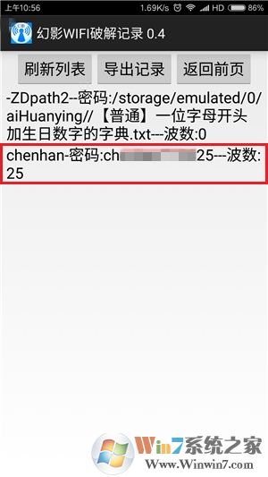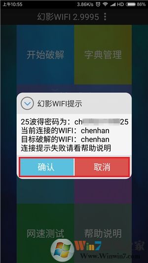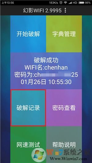 若字典中的某行密碼,嘗試連接目標熱點成功,將立即停止破解并發(fā)出聲音和推送通知。此時軟件還會彈出破解成功的提示,點擊“確認”或‘取消’按鈕可將其關(guān)閉。此外在主界面第二行的藍紫色區(qū)域中,或點擊“破解記錄”都可以查看上一次破解出的熱點名稱和密碼。