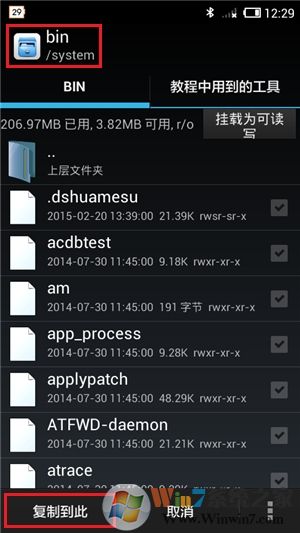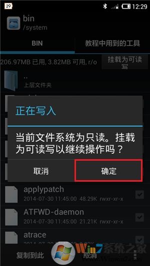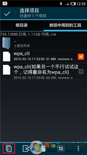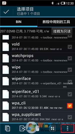 由于安卓默認不支持驗證PIN碼連接無線網(wǎng)絡(luò),故必須將相關(guān)的驅(qū)動功能植入系統(tǒng)中,否則無法通過該軟件實現(xiàn)暴破PIN碼。先在文末附件中下載名稱為“wpa_cli”的內(nèi)核文件,到手機虛擬內(nèi)存的任意位置中,然后打開R.E管理器并在右邊的“存儲”一欄中,找到其所在位置后點擊該文件右側(cè)的勾將其選中,接著點擊底端左側(cè)第一個“復(fù)制”按鈕,然后在左邊的“根目錄”一欄中,找到“/system/bin/”目錄并點擊“復(fù)制到此”將其拷貝到該位置。如果當前文件系統(tǒng)掛載為只讀狀態(tài),此時會彈出修改掛載為可讀寫的提示框,直接點擊“確定”鍵即可。