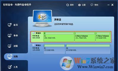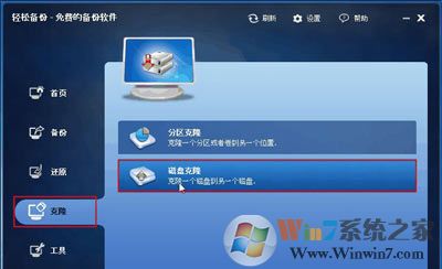 1、 下載免費(fèi)的輕松備份,安裝并運(yùn)行。這里以克隆磁盤(pán)0到磁盤(pán)1為例。來(lái)到主頁(yè)面 “克隆”欄下選擇“磁盤(pán)克隆”。