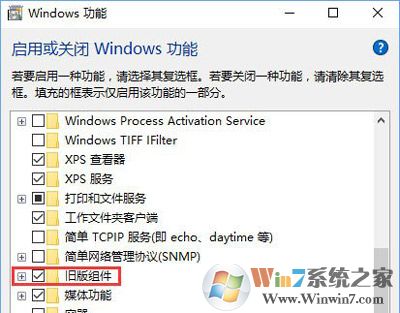 3、打開windows 功能框后,將右側(cè)的滑塊移動(dòng)到底部,找到 舊版組件;
