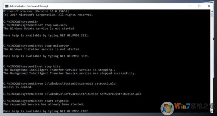 3、通過(guò)輸入以下命令,您將停止BITS,Windows Update,Cryptographic,MSI Installer服務(wù)。不要忘記在每個(gè)按下后按Enter鍵: