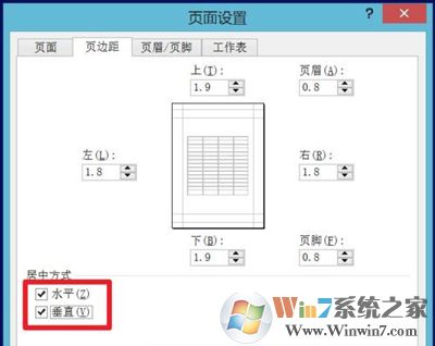 5、在【頁邊距】下,將居中方式的【水平】和【豎直】都打上勾。