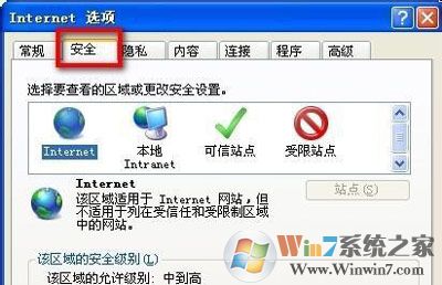 5、在彈出的頁面中,直接選擇“安全”,鼠標選擇“Internet”,在下方有一個“將所有區(qū)域重置為默認級別”這個按鈕,如果是灰色的,說明不能點擊,就不用做任何操作;