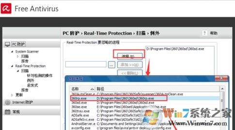 步驟4、設(shè)置進(jìn)程排除例外,點擊進(jìn)程之后,會列出當(dāng)前正在運行的經(jīng)常,選擇其中需要列外的經(jīng)常,點擊確定;