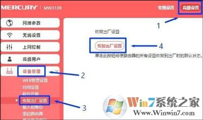 登錄到水星路由器的管理頁面后,請點擊“高級設置”—》“設備管理”—》“恢復出廠設置”選項打開—》然后點擊右側頁面中的“恢復出廠設置”按鈕,如下圖所示