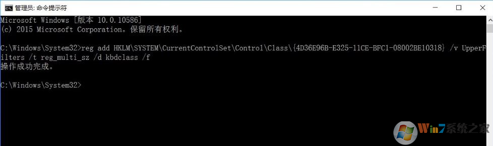 3、在命令提示符窗口輸入:reg add HKLM\SYSTEM\CurrentControlSet\Control\Class\{4D36E96B-E325-11CE-BFC1-08002BE10318} /v UpperFilters /t reg_multi_sz /d kbdclass /f后按回車鍵,然后重啟電腦,重啟之后PS/2的鍵盤鼠標(biāo)就可以正常使用了。