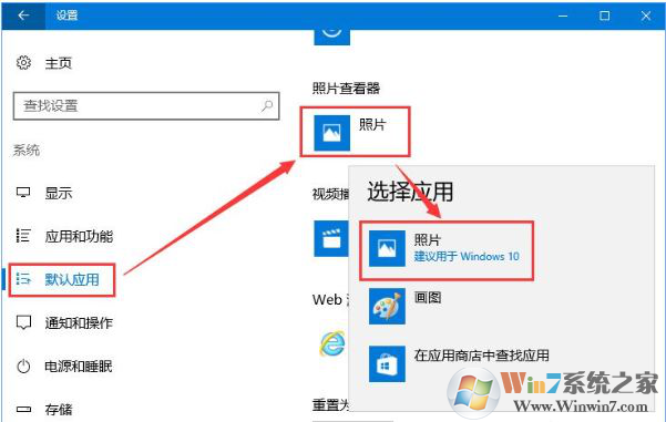 3、在左側點擊【默認應用】,在右側默認應用下面找到【照片查看器】,點擊下面默認的應用,然后換一個查看圖片的程序即可!