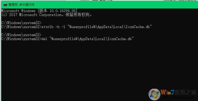 2、刪除圖標(biāo)緩存,管理員命令輸入: