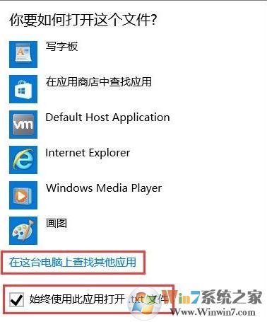 2、點擊“更多應(yīng)用”,下拉到最下面,勾選“始終使用此應(yīng)用打開.txt文件”,然后點擊“在這臺電腦上查找其他應(yīng)用”,如圖所示: