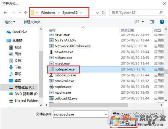 3、如是64位系統(tǒng),打開C:Windows\SysWOW64文件夾,32位系統(tǒng)打開C:Windows\system32,找到并選中“notepad.exe”,點擊打開,之后就可以打開TXT文本文檔了。如圖所示: