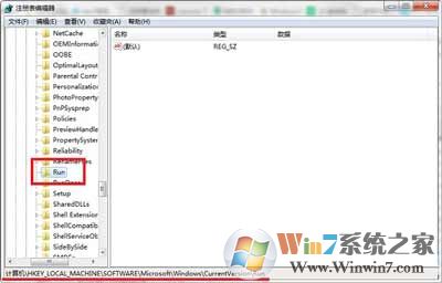 4、打開注冊表編輯器后,依次進入“HKEY_LOCAL_MACHINE\SOFTWARE\Microsoft\Windows\CurrentVersion\Run”,右邊窗口就是開機啟動項了,除了安全軟件之外,其它程序都可以刪除;