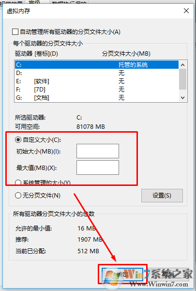 修改win7/win10系統(tǒng)虛擬內(nèi)存的方法如下:右擊我的電腦 > 屬性 > 高級(jí)系統(tǒng)設(shè)置 > 在”性能“處點(diǎn)擊設(shè)置 > 高級(jí)選項(xiàng)卡 > 在”虛擬內(nèi)存“處點(diǎn)擊更改 > 去除”自動(dòng)*所有驅(qū)動(dòng)器的分頁文件大小“選項(xiàng) > 在自定義大小處修改虛擬內(nèi)存的初始大小和最大值 > 點(diǎn)擊”設(shè)置“按鈕后點(diǎn)擊”確定“即可。