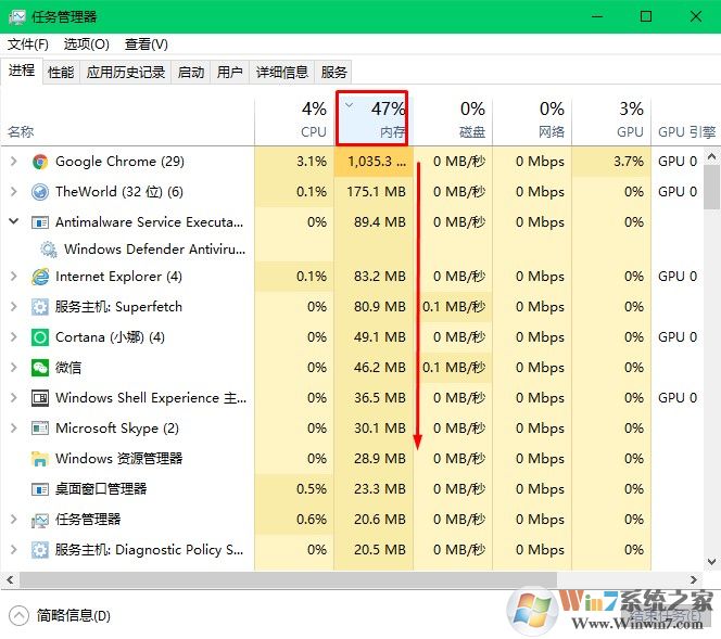 2、切換到進(jìn)程選項(xiàng)卡,點(diǎn)擊一下內(nèi)存標(biāo)簽我們就可以將占用內(nèi)存的程序從高到低排列了。找出進(jìn)程教高的程序并將其結(jié)束即可。但是如果自己在不知道該進(jìn)程是什么情況下最好先百度一下是否可以結(jié)束,不然很容易照成系統(tǒng)崩潰。