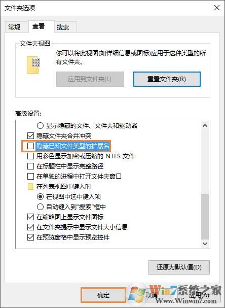 4、不要√勾選“隱藏已知文件類型的擴(kuò)展名,在單擊”確定“。
