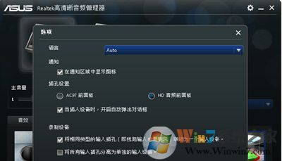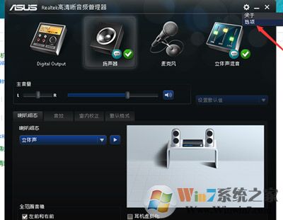 4、在Realtek高清晰音頻管理器界面中,點擊設(shè)置的圖標(biāo),彈出菜單欄,我們選擇“選項”,如下圖所示:
