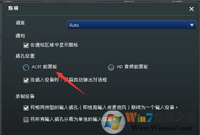 6、將插孔設(shè)置的單選框選擇AC97前面板,并確定,如下圖所示: