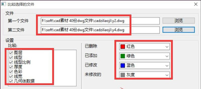 4、待打開“對比文件”窗口后,分別點擊“瀏覽”以選擇兩個相似但有區(qū)域(即可對比性)的CAD文檔。如圖所示: