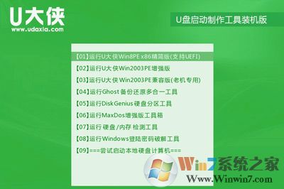 1、首先,準(zhǔn)備一個(gè)制作好的U大俠U盤(pán)啟動(dòng)盤(pán),開(kāi)機(jī)按快捷鍵選擇U盤(pán)啟動(dòng),進(jìn)入U(xiǎn)大俠PE桌面,如下圖所示。