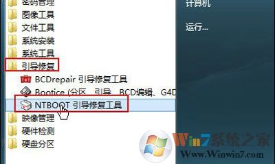 2、進(jìn)入PE桌面后,單擊開(kāi)始菜單,找到“引導(dǎo)修復(fù)-NTBOOT引導(dǎo)修復(fù)工具”,單擊打開(kāi),如下圖所示: