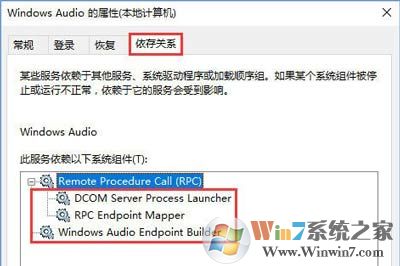 1、首先進(jìn)入服務(wù)雙擊打開Windows audio屬性,在“依存關(guān)系”選項(xiàng)卡中可以看到所依賴的3個(gè)服務(wù)名稱,如圖:
