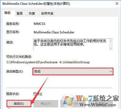 2、通過依賴組可以發(fā)現(xiàn)“Multimedia Class Scheduler”服務(wù)是禁用狀態(tài),雙擊打開其屬性;