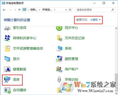 2、在下面點擊【語言】(如果找不到先將右上角的查看方式改成大/小圖標(biāo));