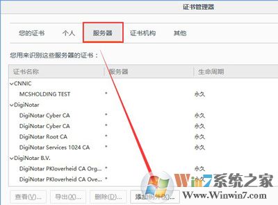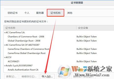 2、在“證書管理器”對話框中轉(zhuǎn)到“證書機構(gòu)”選項卡,點擊“導(dǎo)入(M.。。)”按鈕。