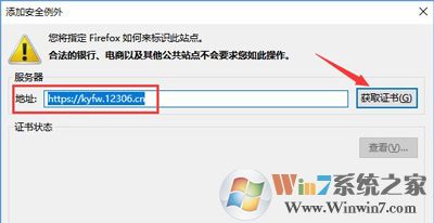 4、在“添加安全例外”對話框中,輸入你要添加例外的服務(wù)器地址,點擊“獲取證書(G)”。