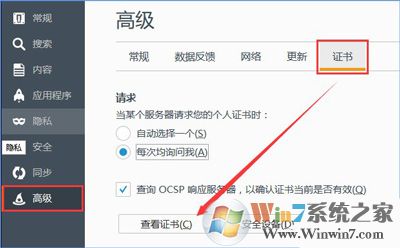 2、打開火狐瀏覽器設(shè)置頁--高級--證書,點擊“查看證書(C)”按鈕。