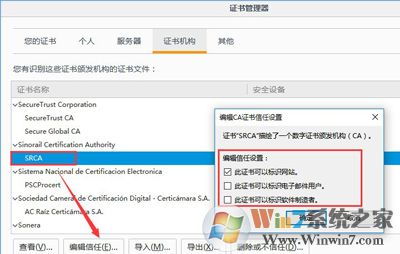 5、如果你上一步的勾選需要修改,可以找到該證書名稱(12306直接就是SRCA),點擊“編輯信任(E)。。。”按鈕即可。