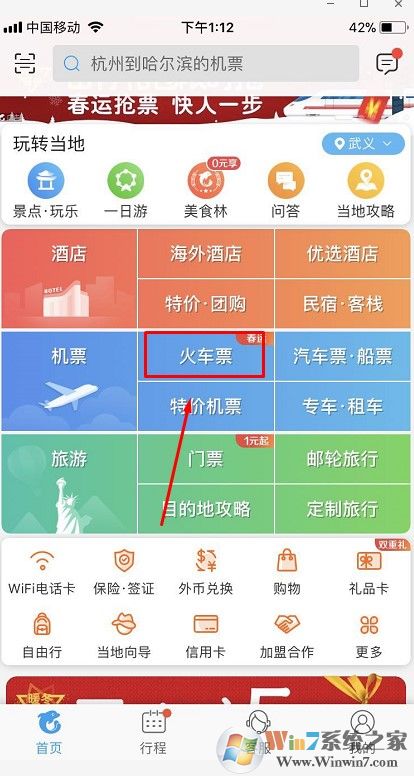 1、打開(kāi)攜程手機(jī)app,然后點(diǎn)擊火車(chē)票。
