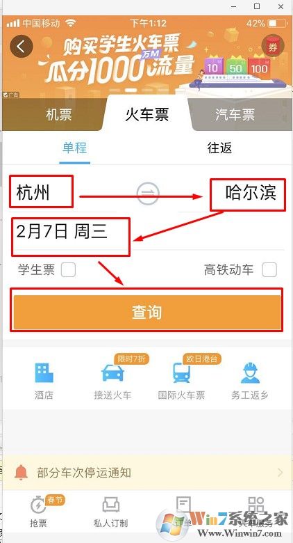 2、選擇好自己的出發(fā)地和目的地,設(shè)置好出發(fā)日期然后點(diǎn)擊查詢。