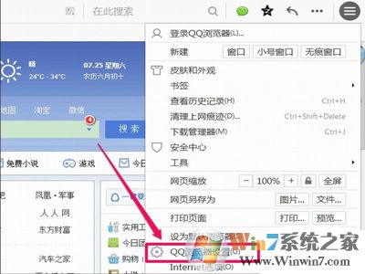 2、打開后,從菜單中找到并選擇“QQ瀏覽器設(shè)置”這一項,打開它。