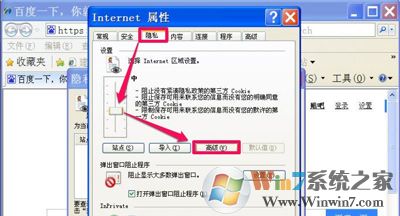 6、進入Internet選項的“隱私”選項卡,在網(wǎng)站級別上設(shè)置為“中”,然后點擊“高級”按鈕。