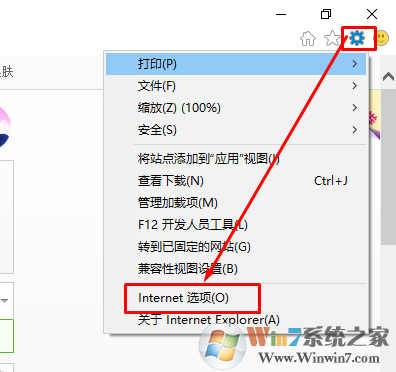 1、打開IE,左鍵點擊右上角齒輪,點選【internet選項】。