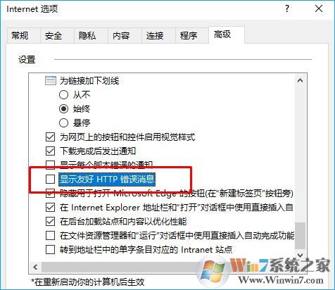 3、切換到【高級(jí)】選卡下,在設(shè)置列表中找到“顯示友好HTTP錯(cuò)誤信息”,取消其勾選狀態(tài),點(diǎn)擊確定即可;