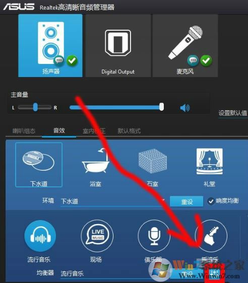 2、打開聲音管理器,可以看到揚(yáng)聲器有四個(gè)選項(xiàng):喇叭組態(tài)、音效、室內(nèi)矯正、默認(rèn)格式;