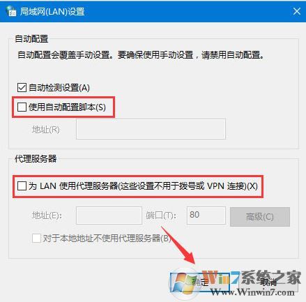3、在局域網(wǎng)設(shè)置界面將 【使用自動(dòng)配置腳本】、【為lan使用代理服務(wù)器】的勾去掉,點(diǎn)擊確定- 確定 保存設(shè)置。