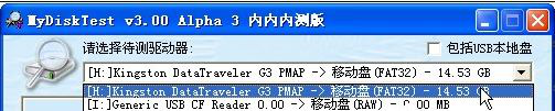 2、首先我們將要測試的U盤插入到電腦上,再打開MyDiskTest,如果你的電腦上插入了多個U盤,你還得從下拉列表中選擇你要測試的U盤。