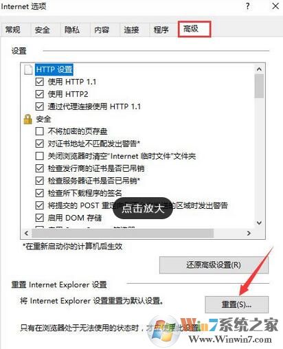 2、切換到【高級(jí)】選卡,在下面點(diǎn)擊【重置】。