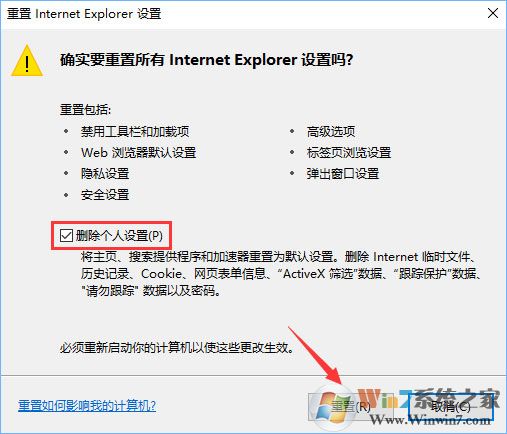 3、勾選【刪除個(gè)人設(shè)置】,點(diǎn)擊【重置】即可。