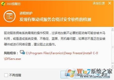 步驟二:在自動安裝的過程中,就會彈出如以上圖片的彈窗報錯。在遇到以上情況時,大家不必驚慌,這是由于360軟件檢測出來的電腦在安裝軟件時,會修改驅(qū)動的正常提示,這里只需用鼠標點擊右下角的更多按鈕,然后在彈出的下拉框中選擇“允許程序所有操作”,如下圖所示,這樣就可以不再出現(xiàn)彈框,從而在電腦上成功安裝冰點還原軟件。